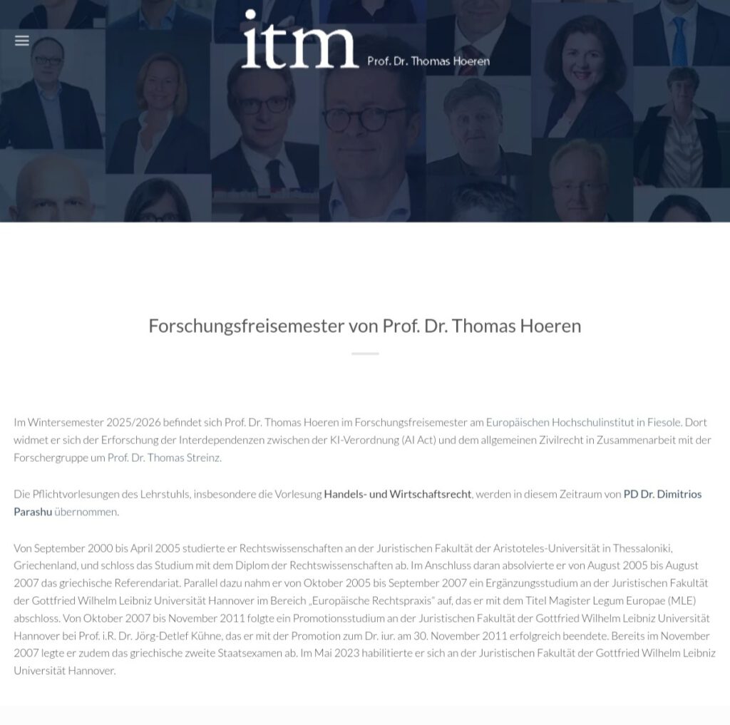 Es ist mir als Privatdozent der Juristischen Fakultät der Gottfried Wilhelm Leibniz Universität Hannover eine immense Freude und Ehre, seit dem 15. März 2024 auch als Koordinator Rechtslehre im Maschinenbau der Fakultät für Maschinenbau der Gottfried Wilhelm Leibniz Universität Hannover (siehe oben, Website der Fakultät für Maschinenbau) tätig zu sein: Der ältesten Fakultät unserer Universität (mit Wurzeln, die sich bis 1831 zurückverfolgen lassen)!